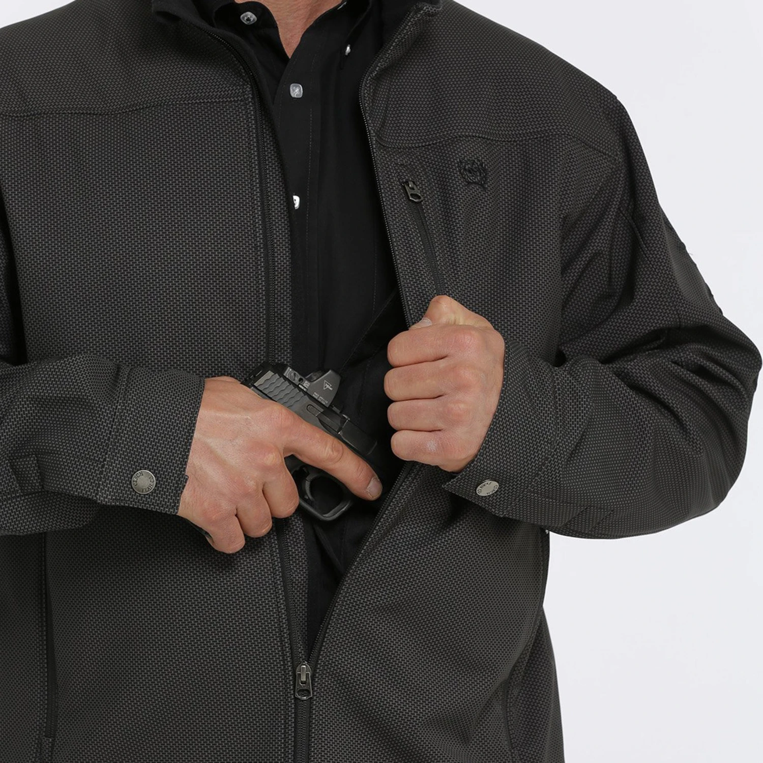 Be ready for whatever life throws at you in this brown concealed carry bonded jacket from CINCH! It features dual concealed inner pockets and a Velcro backed holster, which gives you convenient access to your firearm. It is made of a flexible poly-spandex bonded construction that has contrast lining, exterior zipper pockets, the famous CINCH logo embroidered and a durable water resistant (DWR) finish.