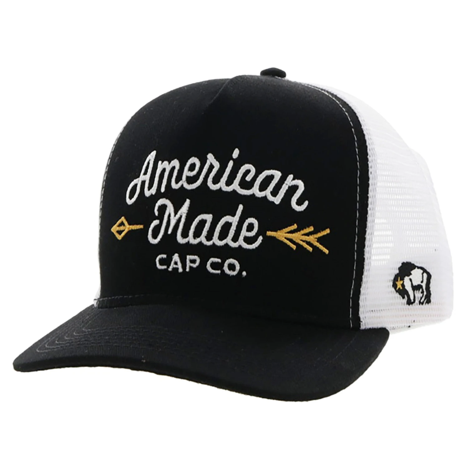 Look at this black and white American Made ball cap. Not only does the gold make the hat stand out it adds a pop of color.