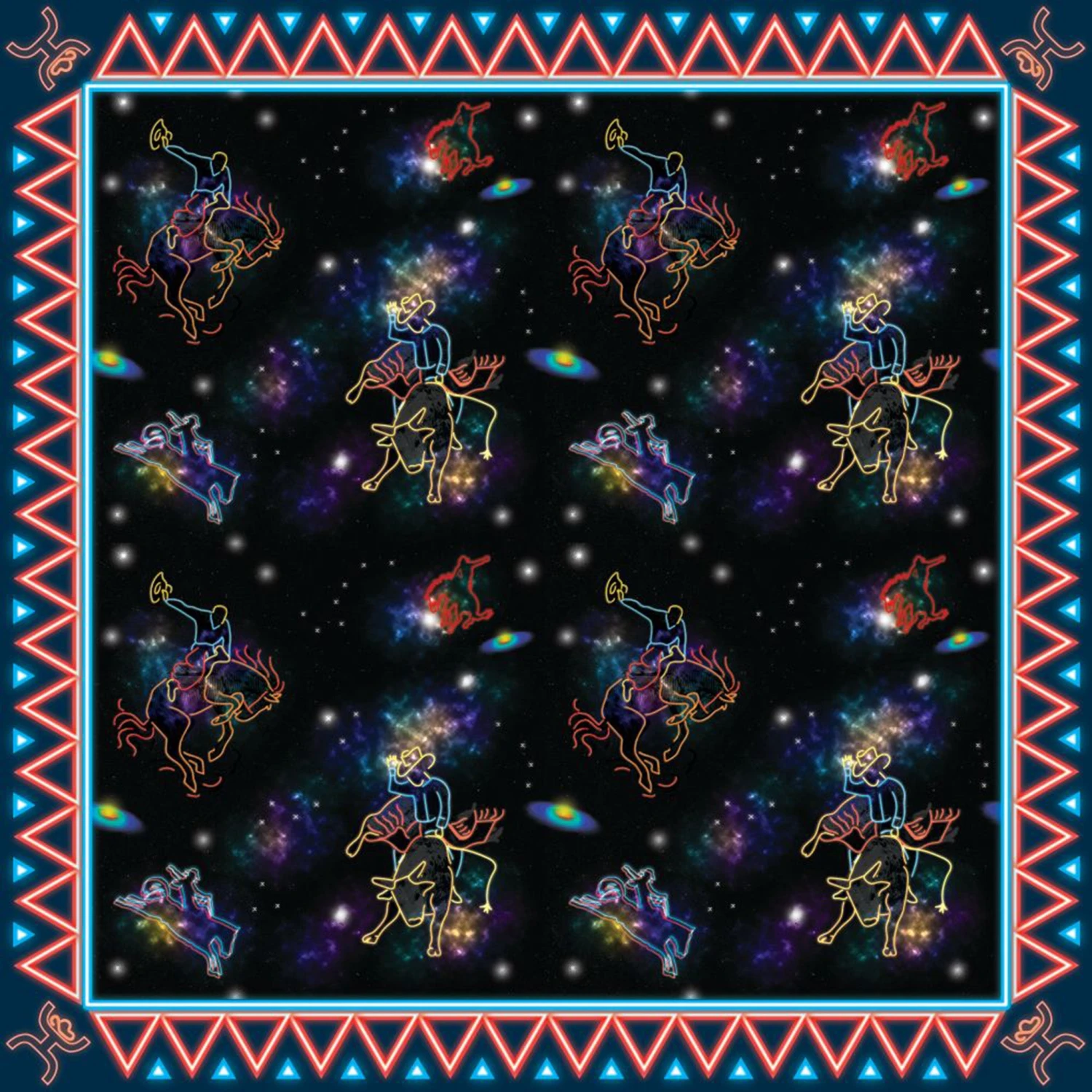 This wild rag has neon outlines, a galaxy and Aztec pattern. The bright colors of yellow, red, blue, orange, and pink stand out on the black background.